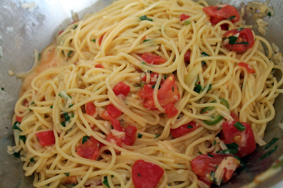 Die abgetropften etwas ausgekühlten Spaghetti, die Kräuter-Tomaten-Zwiebel Mischung unter die Ei-Parmesan Masse heben.