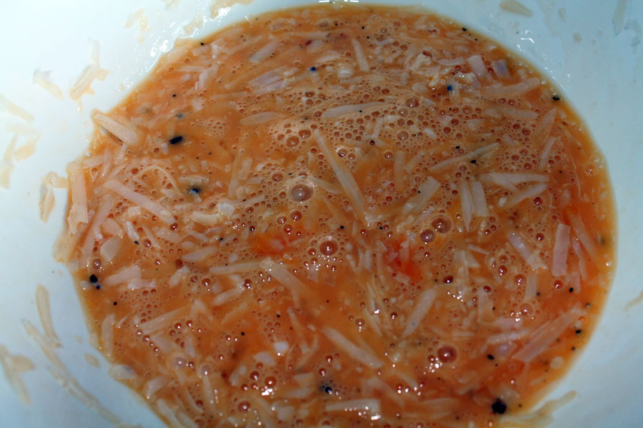 In einer großen Schüssel die Eier verquirlen, den Parmesan grob reiben und unterrühren.