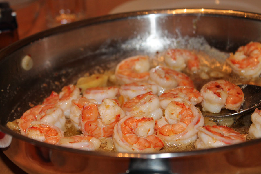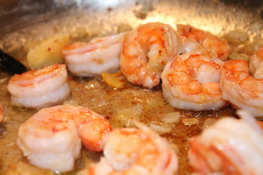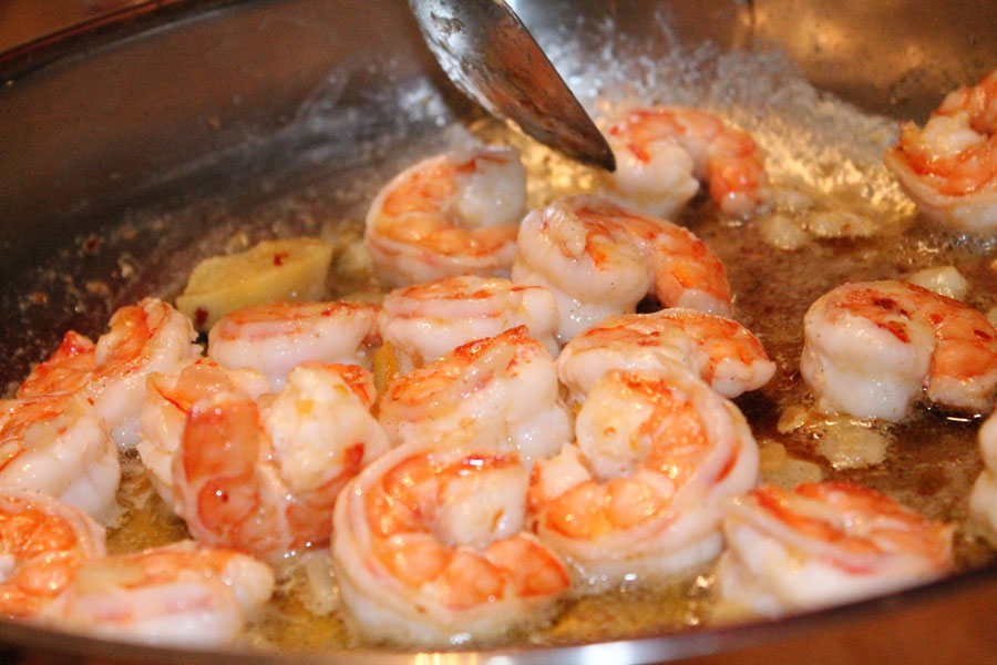 Die Garnelen dann in die Gewürzbutter geben, schwenken und etwas ziehen lassen.
