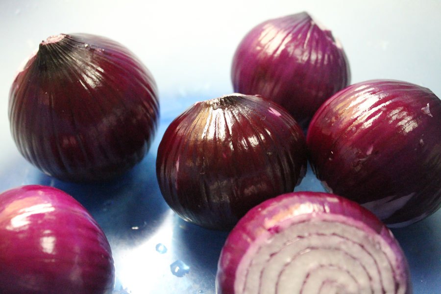 Die roten Zwiebeln schälen und die Wurzeln so abschneiden, dass die Zwiebel nicht auseinanderfällt.