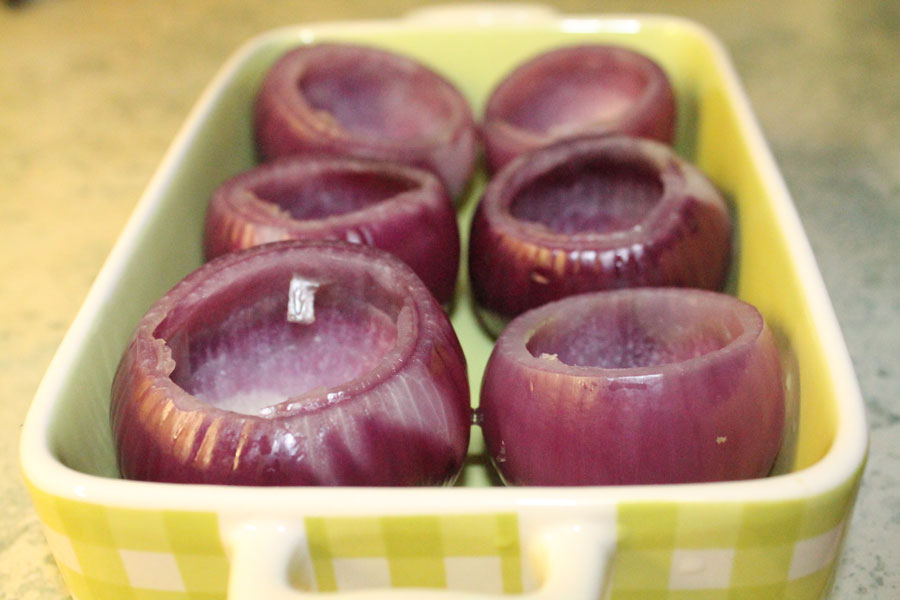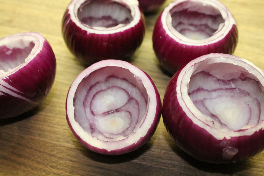 Die ausgehöhlten Zwiebeln in heißem Salzwasser kurz blanchieren, in Eiswasser abschrecken und in einem Sieb abtropfen lassen.