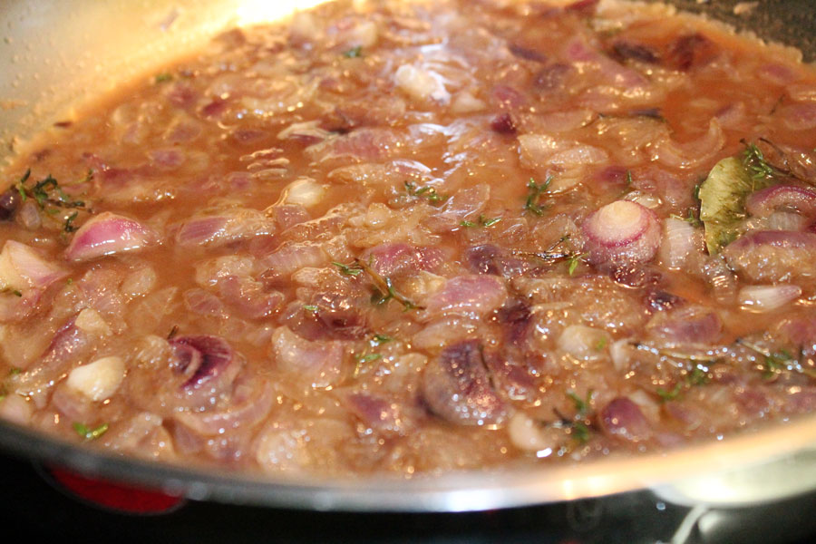 Das Lorbeerblatt und zwei Zweige Thymian dazugeben und alles leicht einköcheln lassen, bis die Zwiebeln weich sind.