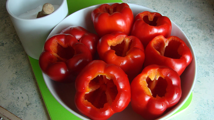 Von den Paprika den Deckel abschneiden und die Kerne und Trennwände im Inneren der Schoten herausschneiden.
