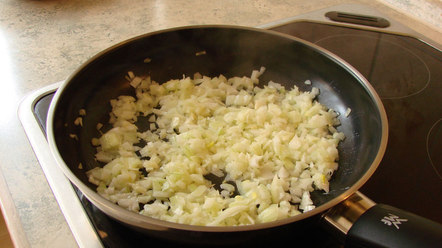 Die Zwiebeln schälen und in einem Topf in Olivenöl glasig dünsten.