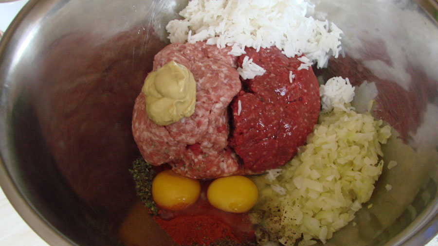 Die beiden Sorten Hackfleisch mit den Zwiebeln, Eiern, Senf, Majoran, Piment, Kümmel, Paprikapulver und Salz gut vermischen.