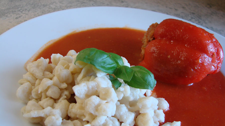 Die Spätzle zu den gefüllten Paprikaschoten servieren.
