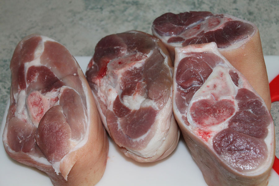 Die Schweinshaxen, das Gemüse und die Gewürze hineingeben.