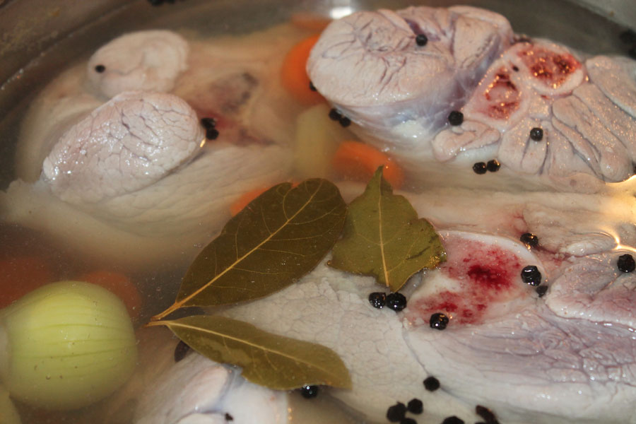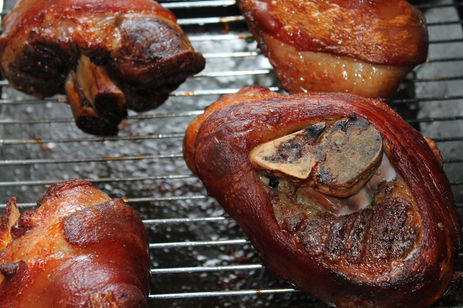 Die Haxen aus dem Kochtopf nehmen und auf das Gitter legen.