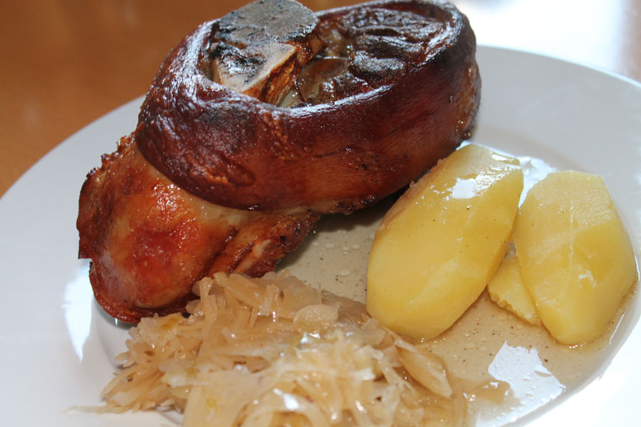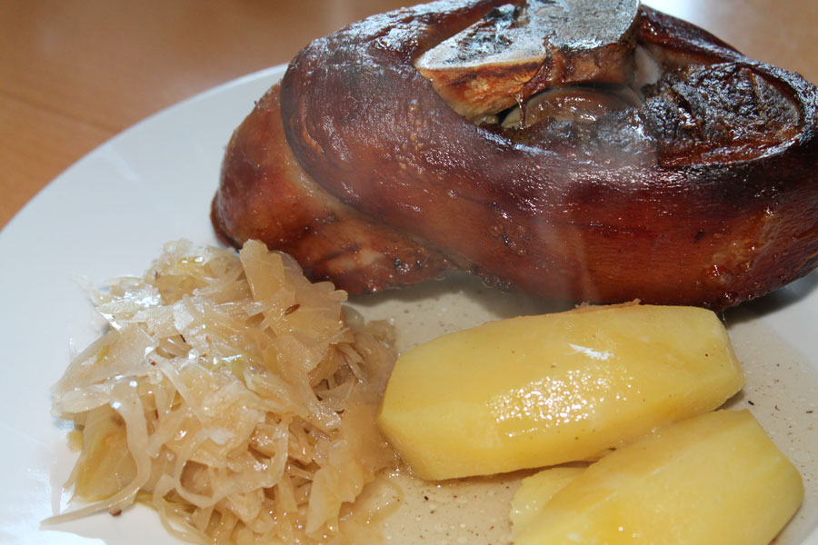 Die Grillhaxen mit Kartoffeln und Sauerkraut servieren.
