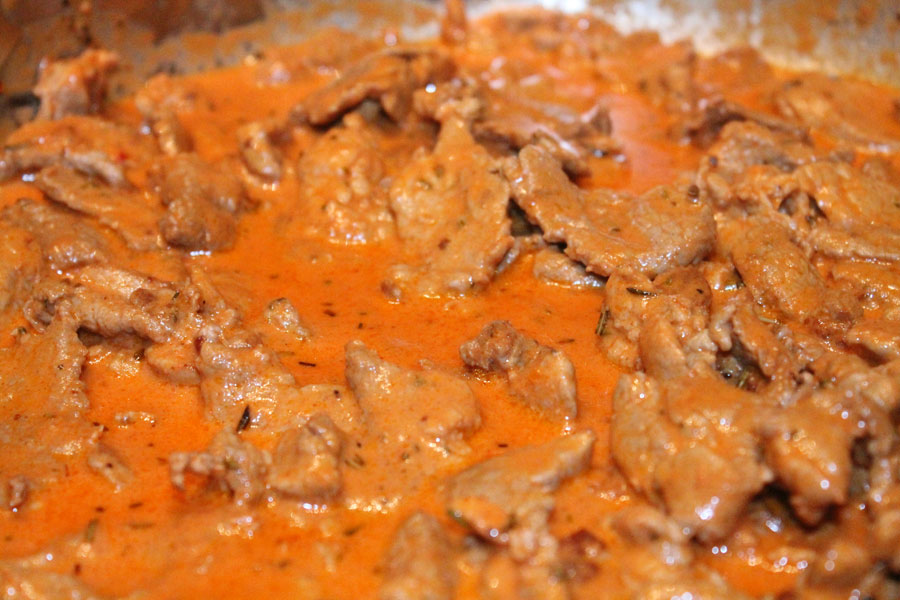 Butterschmalz in einer Pfanne erhitzen und die Filetstreifen von beiden Seiten portionsweise kurz anbraten.