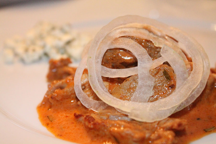 Mit dünn gehobelten Zwiebelscheiben und klein gewürfeltem Fetakäse anrichten.
