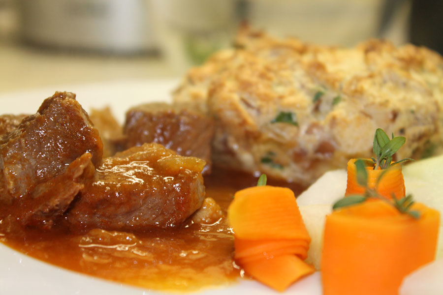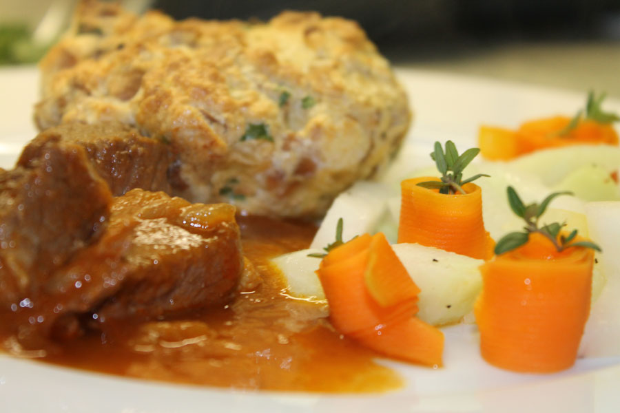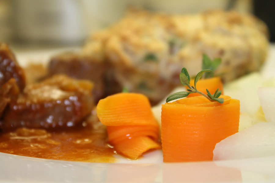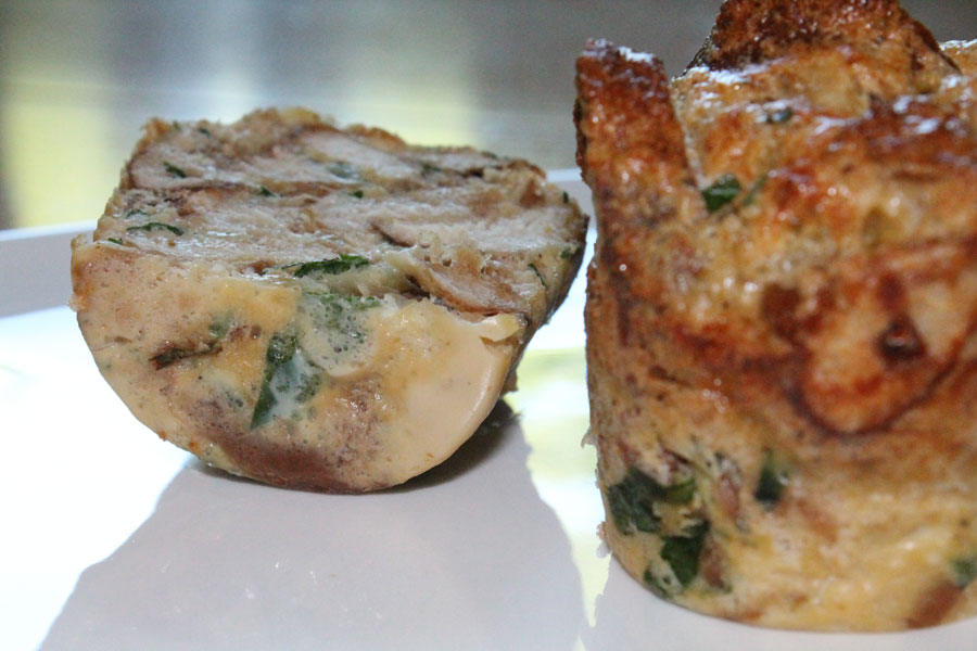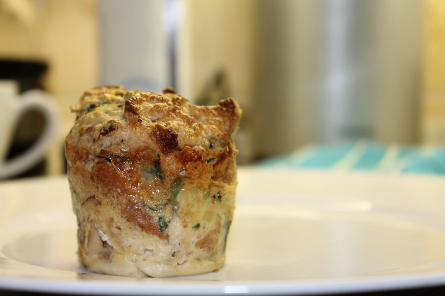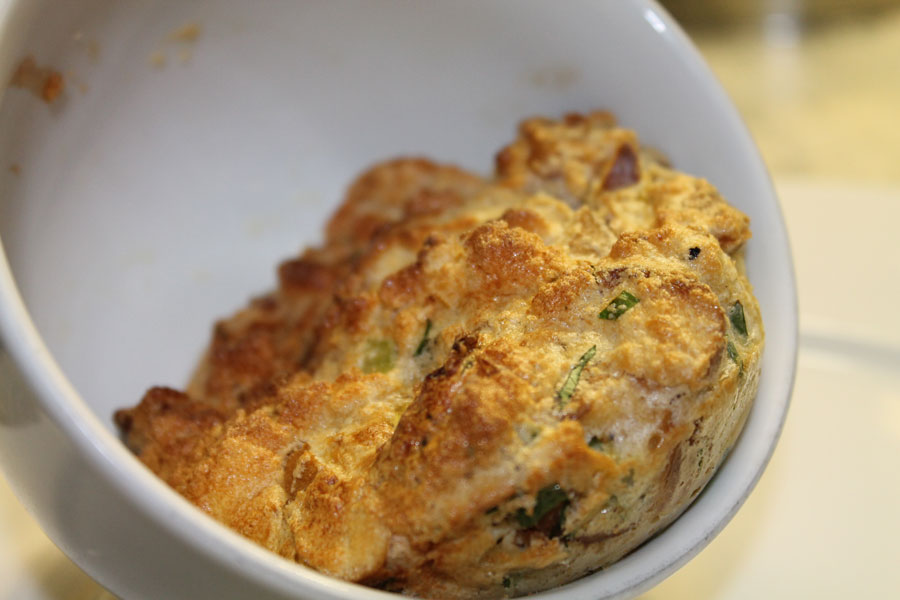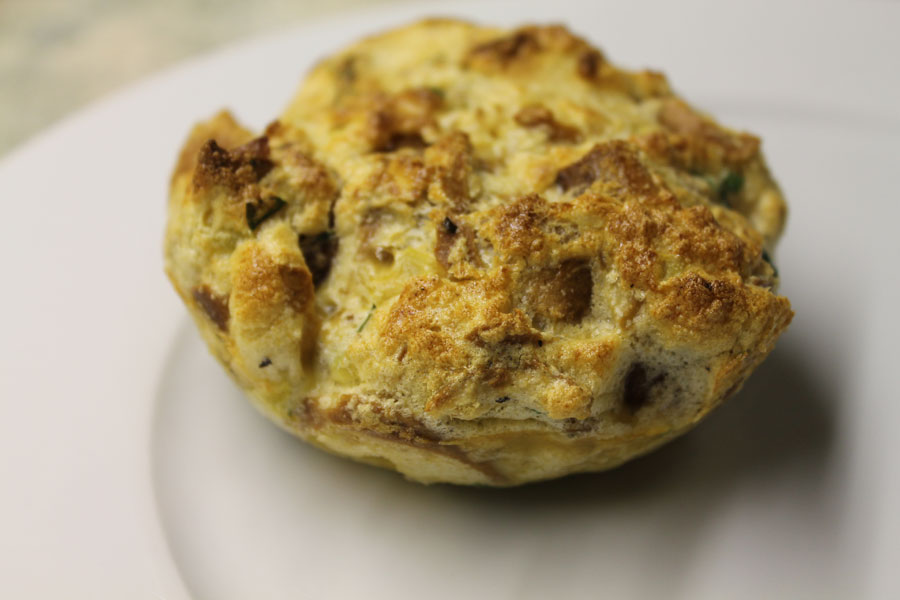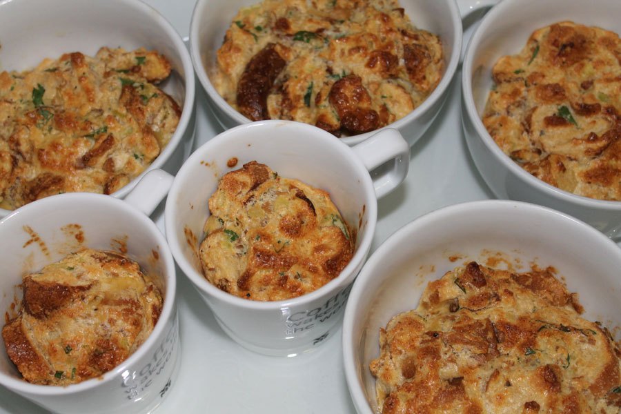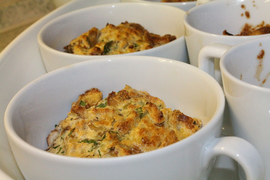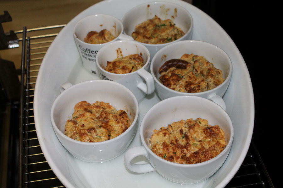 Die Knödel mit einem Messer aus den Tassen lösen. Am besten mit der knusprig gebackenen Seite nach oben auf dem Teller servieren, nicht stürzen.