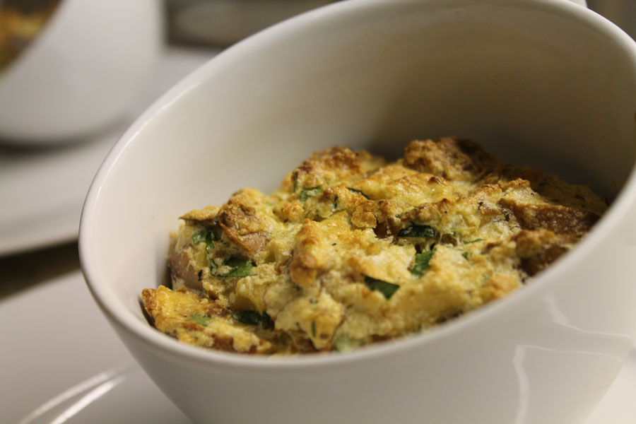Die durchgezogenen Laugenbrezel-Stücke mit dem Eigelb, den gedünsteten Zwiebeln und der gehackten Petersilie vermengen.