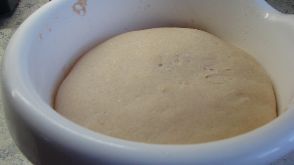 Die Schüssel abdecken und den Teig an einem warmen Ort ca. eine 3/4 Stunde gehen lassen. Der Teig muss sich verdoppeln.