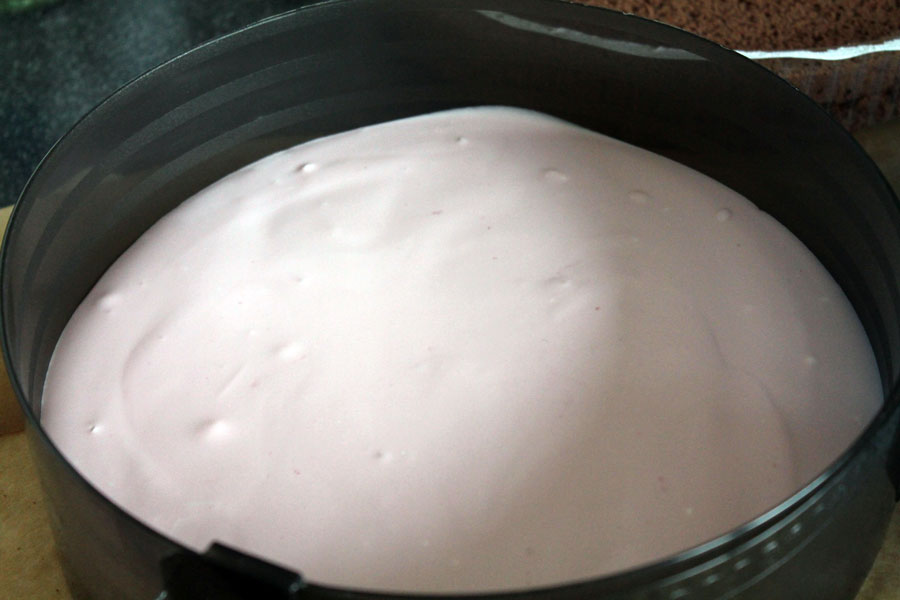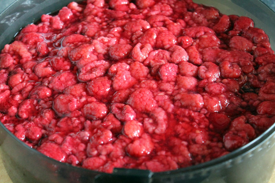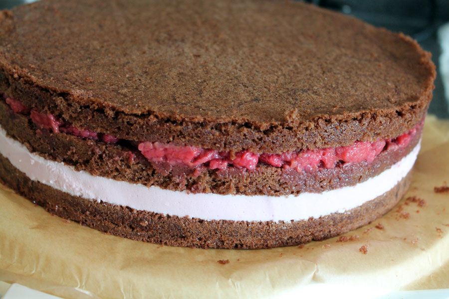 Den zweiten Tortenboden auflegen und die Himbeermasse gleichmäßig darauf verteilen.