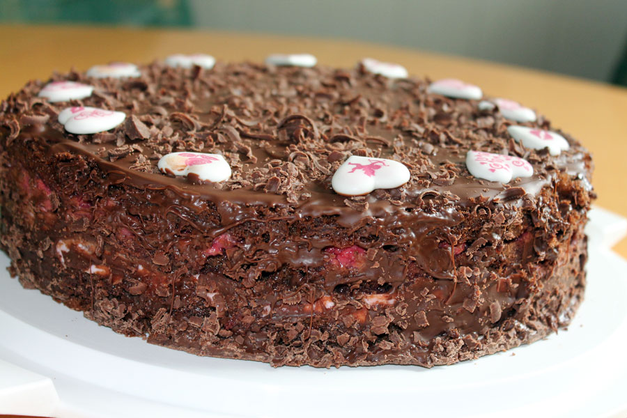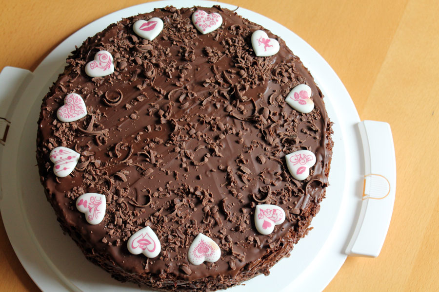 Am nächsten Tag die Kuvertüre im Wasserbad schmelzen und die Torte damit gleichmäßig überziehen.