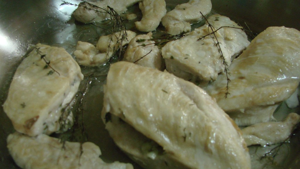 Die Hähnchenbrüste herausnehmen und die Thymianzweige entfernen.
