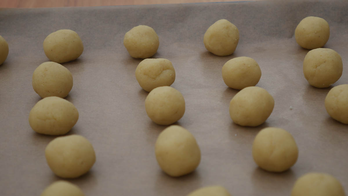 Die Kugeln mit etwas Abstand auf ein mit Backpapier belegtes Backblech legen.