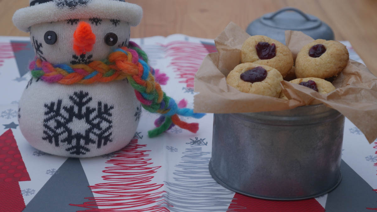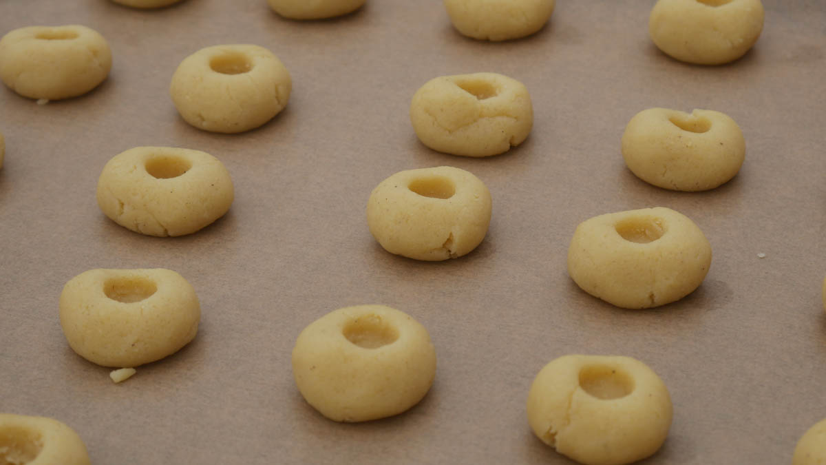 Tipp: Es kann schon etwas tiefer sein, damit nach dem Backen ein schöner Tupfer Gelee reinpasst. Der Plätzchenteig geht beim Backen noch ein wenig auf.