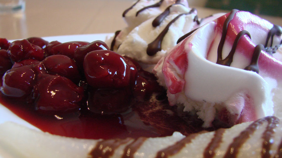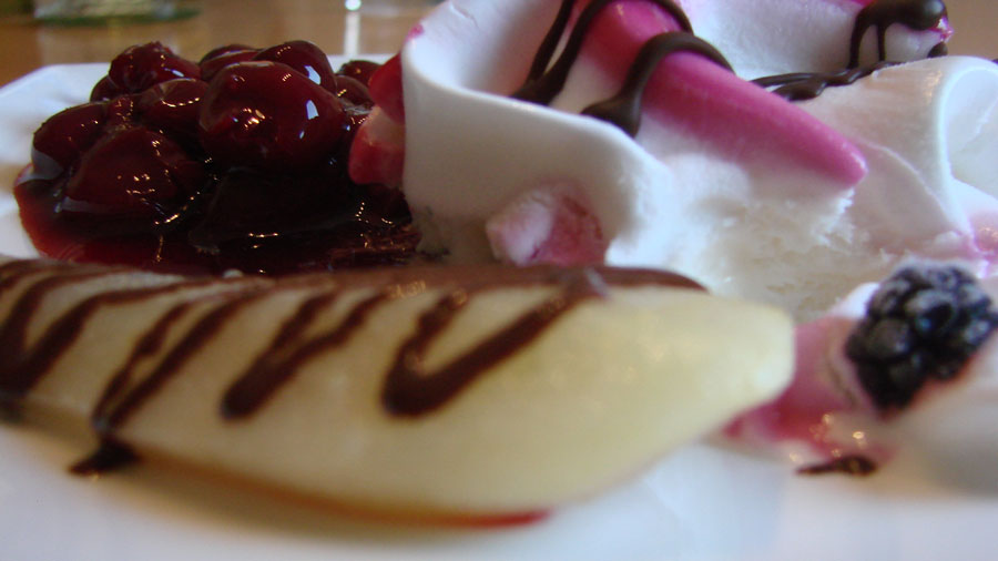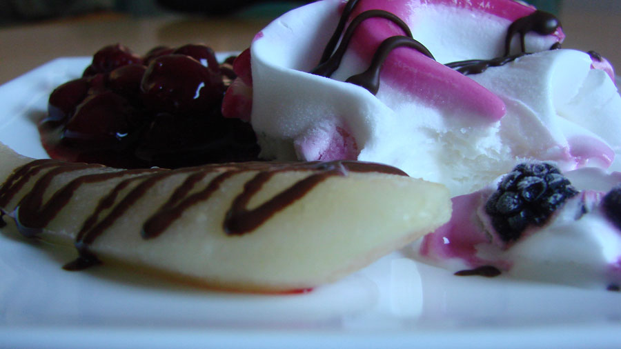 Joghurt-Waldbeer Eis mit Kirschgrütze und Schoko-Birne