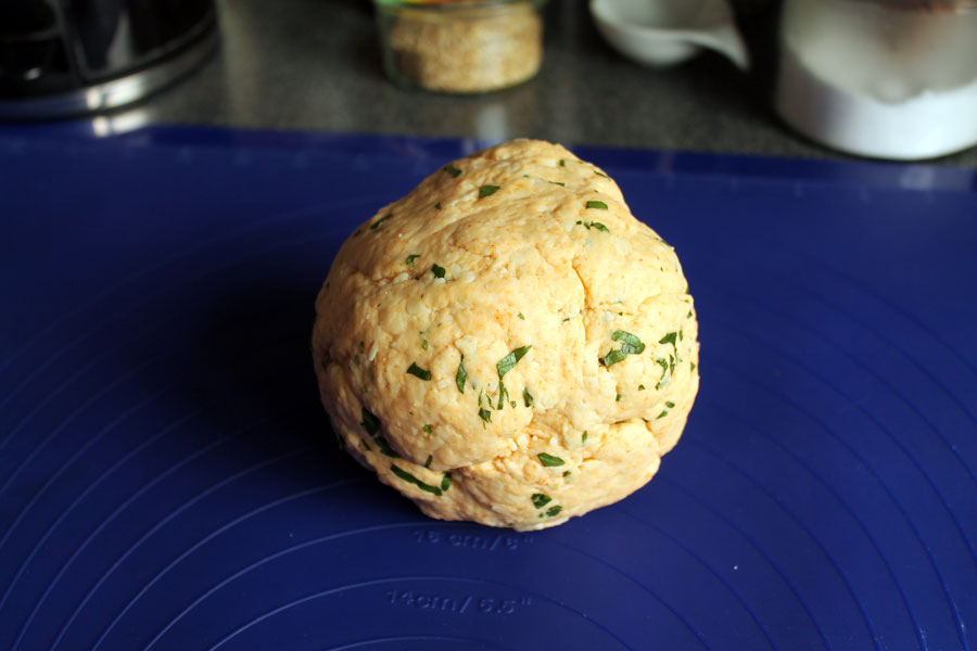 Aus den Zutaten Mehl, Quark, geraspeltem Käse, Backpulver, Salz, Paprikapulver und Petersilie einen glatten Teig kneten.