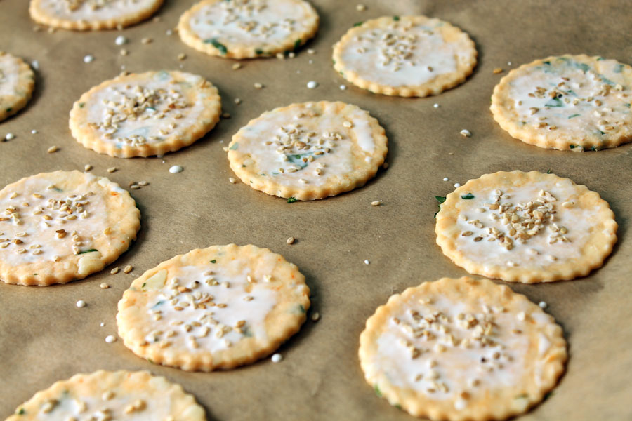 Die Plätzchen auf ein mit Backpapier belegtes Blech legen und die Oberseite mit Sahne bepinseln und gleichmäßig mit Sesam bestreuen.