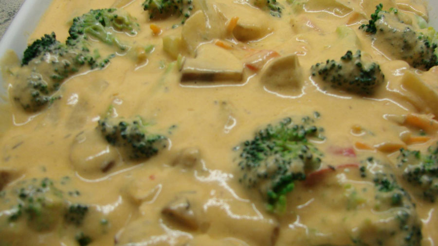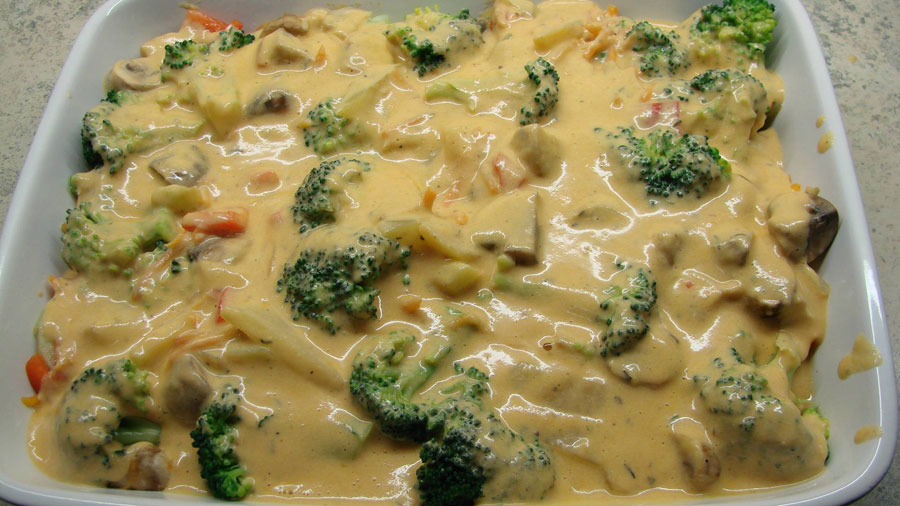 Den Broccoli in Röschen teilen, waschen und in kochendem Salzwasser kurz blanchieren. Dann in Eiswasser abschrecken. Die Mohrrübe und den Kohlrabi schälen und in dünne Streifen schneiden. Die Champions mit einem Tuch oder Pinsel säubern und vierteln. Die Paprikaschote schälen und in Rauten schneiden. 1 EL Butter in einer Pfanne erhitzen und die Pilze anbraten. Dann die Mohrrübe, den Kohlrabi und die Paprikaschote dazugeben und kurz mit braten. Die Pellkartoffeln ohne Schale in dünne Scheiben schneiden. Dann die Kartoffeln und das Gemüse abwechselnd in eine große Auflaufform schichten. Die Sauce darauf verteilen. Den Bergkäse grob raspeln und darüber streuen und schon ist der leckere Kartoffel-Gemüse Auflauf fast fertig. Jetzt muß er nur noch für 30 Minuten in den vorgeheizten Backofen bei 180 °C.