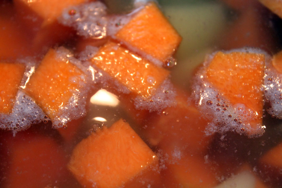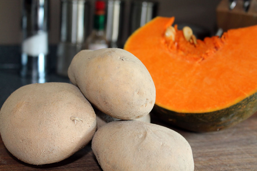 Wenn die Kartoffeln aufkochen, den Kürbis dazugeben.
