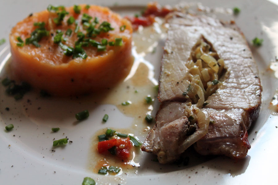 Ich habe dieses Kartoffel Kürbis Püree zu gefüllten Kotelett serviert.
