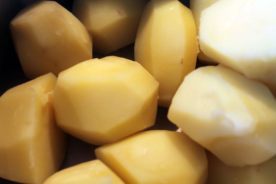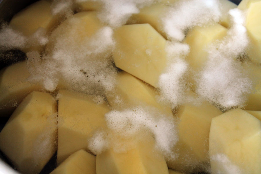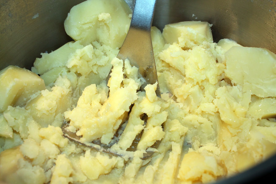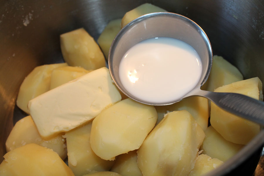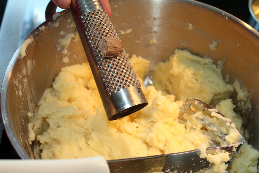 Für das Kartoffelpüree die Kartoffeln schälen, in kaltem Wasser waschen, die größeren Kartoffeln halbieren und in einen Topf geben. Die Kartoffeln sollten knapp mit Wasser bedeckt werden. Nun Salz hinzufügen und die Kartoffeln gar kochen. Die Garzeit dauert ca. 20 Minuten. Sind die Kartoffeln weich muss das Wasser abgegossen werden und ich lasse die Kartoffeln dann noch kurz auf der heißen Kochplatte ausdampfen. Dann kommt die Milch und die Butter dazu und die Kartoffeln werden mit einem Kartoffelstampfer zerdrückt. Ich nehme dazu nie einen Mixer, da das Kartoffelpüree sonst kleistrig und gummiartig klebrig wird. Zum Schluss das Püree mit etwas geriebener Muskatnuss, Pfeffer und eventuell noch etwas Salz abschmecken. Fertig ist die perfekte Beilage zu Fisch, Fleisch oder Gemüse. Tipp: Ich gebe oft meinem Kartoffelbrei etwas Pepp mit ein paar Frühlingszwiebelringen. Die Frühlingszwiebeln werden aber nicht roh unter das Püree gehoben, sondern kurz in Butter glasig geschwenkt und dann in das Kartoffelpüree gegeben.