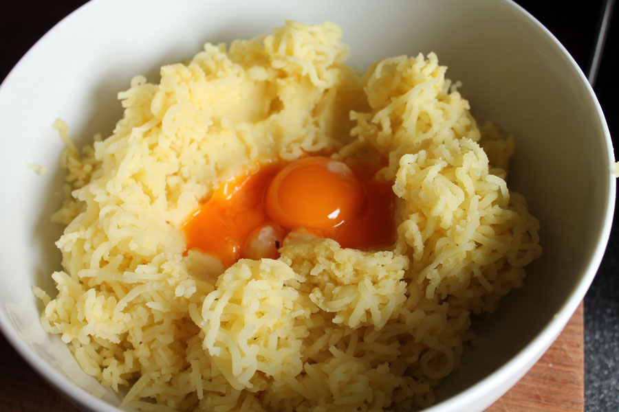 Die Pellkartoffeln vom Vortag schälen und mit einer Rösti-Reibe raspeln.