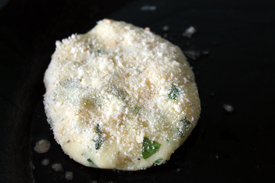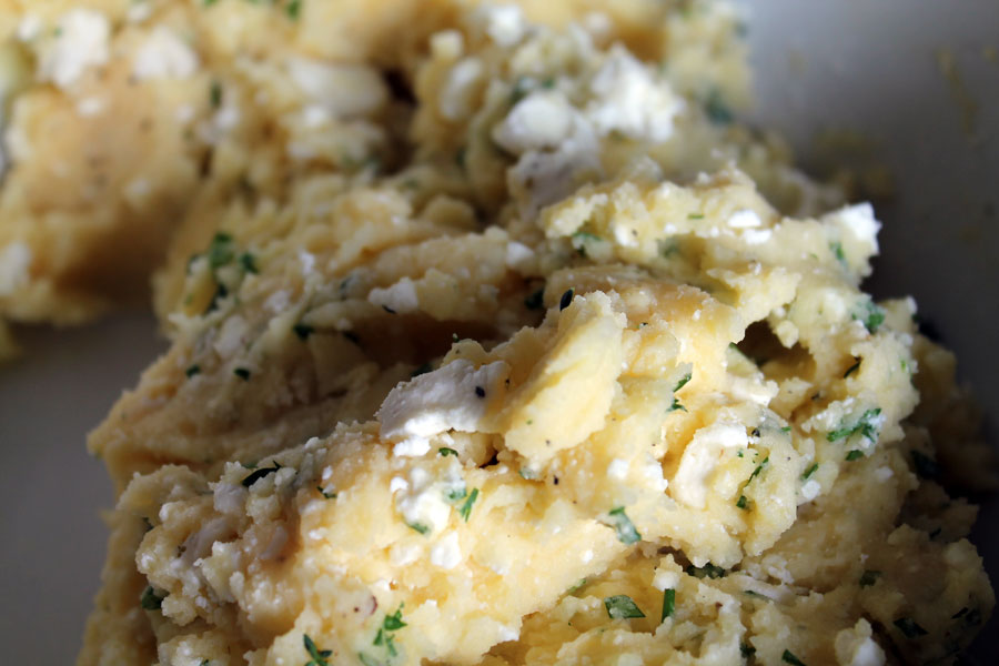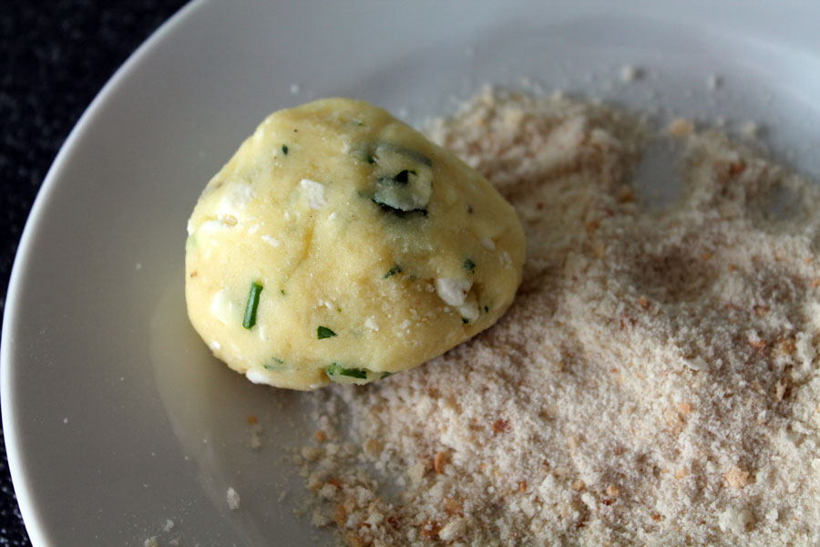 Die Pellkartoffeln vom Vortag schälen und mit einer Rösti Reibe (Link zu ebay) raspeln. Dann die Eigelbe, ein wenig Salz, Pfeffer, die gehackte Petersilie, die Blätter vom frischen Thymian und den in Stücke geschnittenen Schafskäse dazu geben und alles leicht vermengen. Nun mit etwas bemehlten Händen kleine Kugeln formen und etwas flacher drücken, das heißt Taler formen. Dann die Taler in Semmelmehl wälzen und in heißem Rapsöl bei mittlerer Hitze von beiden Seiten goldbraun braten.