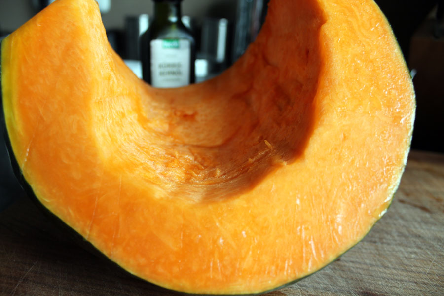 Zuerst das Stück Muskatkürbis schälen und das Kerngehäuse entfernen.