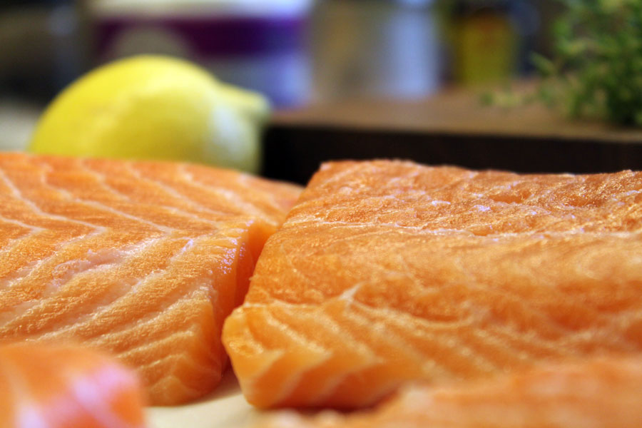 Jetzt den Lachs (ohne Haut) mit Salz würzen und auf einen Teller legen.