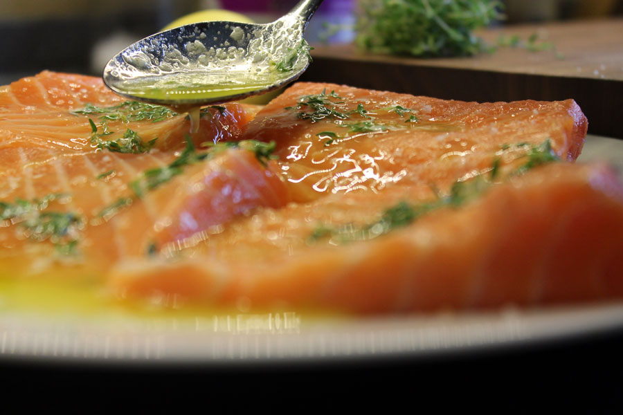 Lachs ist nicht ganz einfach zuzubereiten, denn Lachs falsch zubereitet wird schnell trocken und fade. Um das feine Fleisch des Lachs zu schützen sollte man es immer sehr vorsichtig und behutsam garen. Ich schützte das Fleisch indem ich es mit Frischhaltefolie vor dem Austrocknen schützte. Da ich den Lachs nur bei 80°C im Backofen gare und die Frischhaltefolie diese Temperatur problemlos aushält, ohne zu schmelzen, ist das eine Garmethode mit dem man den Lachs sanft und sehr köstlich zubereiten kann.