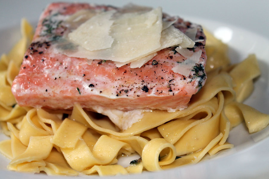 Bei 80°C Umluft den Lachs ca. 20 Minuten garen. Vor dem Servieren mit frisch gemahlenem Pfeffer würzen.