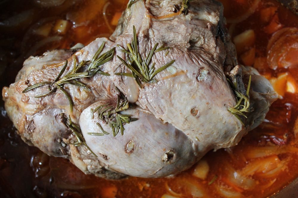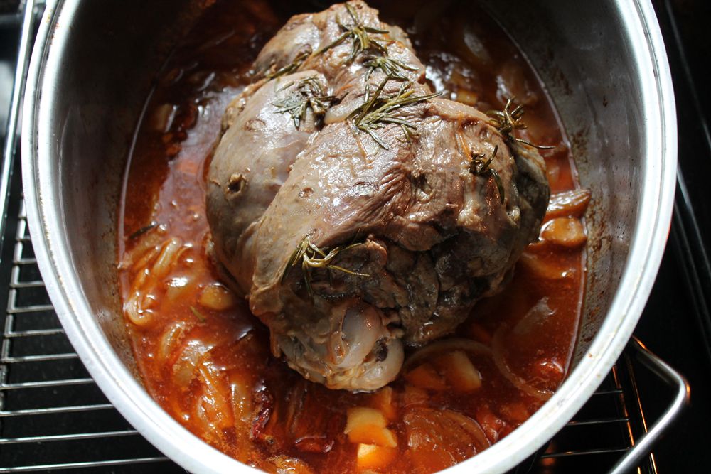 Eine Lammkeule ist ein ideales Schmorgericht. Bei vorsichtigem Garen bleibt das Fleisch schön saftig.