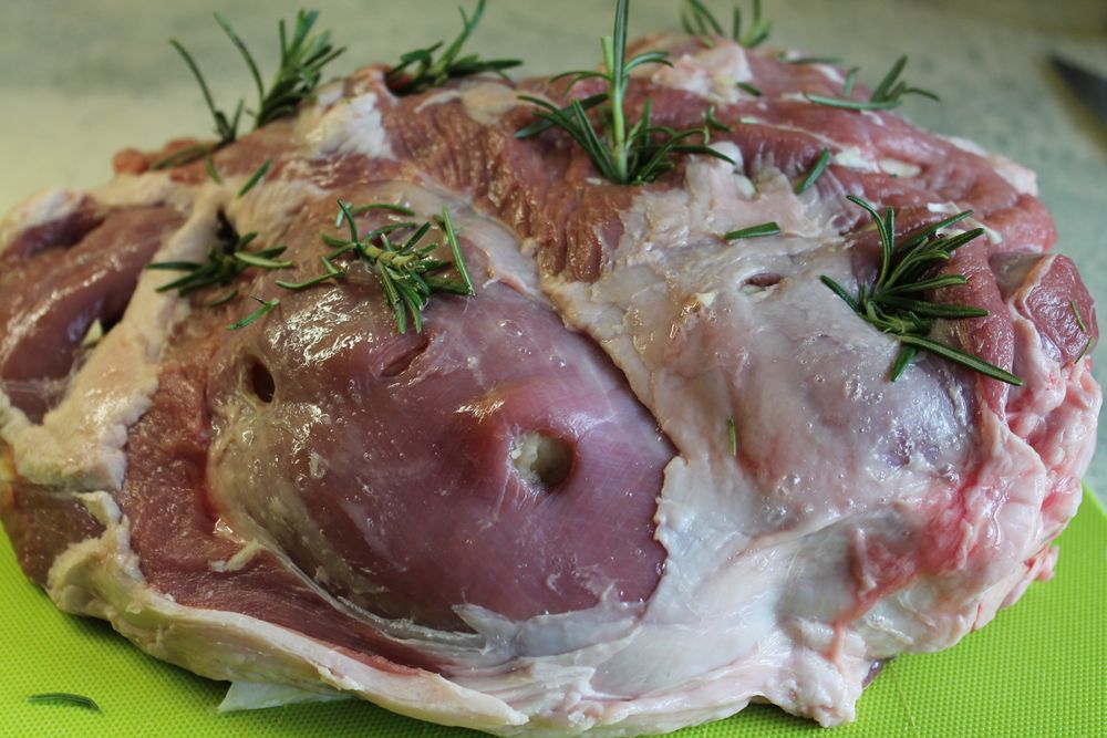 Von der Lammkeule das dicke Fett abschneiden. Ein paar Knoblauchzehen schälen und in Stifte schneiden. Die Rosmarinzweige klein schneiden. Die Lammkeule mit den Knoblauchstiften und dem Rosmarin spicken.