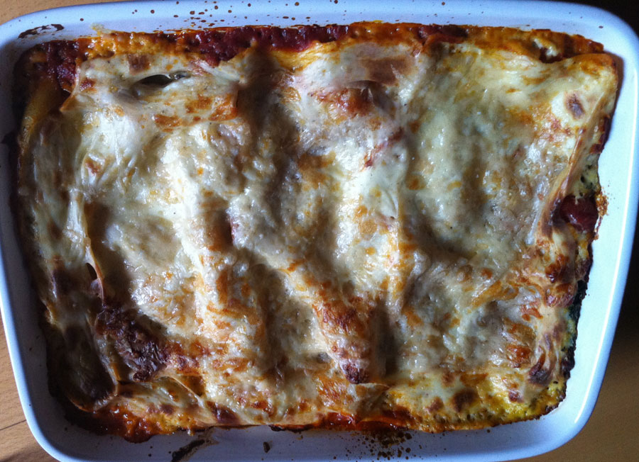 Eine Auflaufform mit Olivenöl einpinseln, als erste Schicht Hackfleischsauce einfüllen, dann zwei Lasagne Blätter darauflegen, dann eine Schicht Béchamel Sauce.