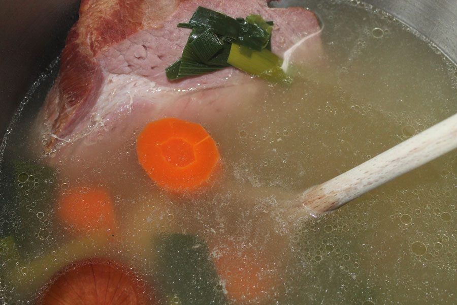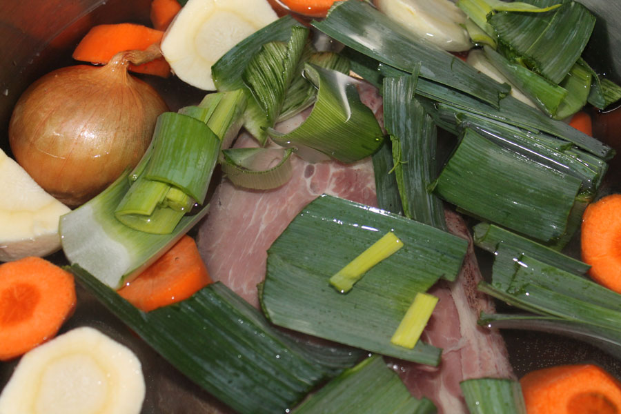 Den Kassler Kamm in einen Topf mit dem kleingeschnittenen Gemüse und Zwiebeln geben, mit Wasser bedecken und bei mittlerer Temperatur gar kochen.