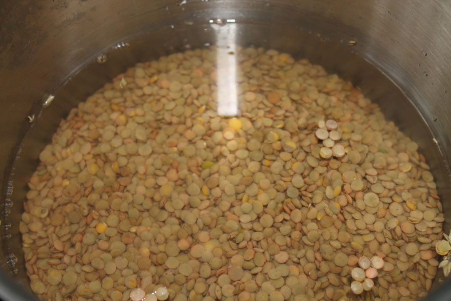 Die Linsen in einem zweiten Topf mit der doppelten Menge Wasser ca. 30 Minuten ohne Salz garen.