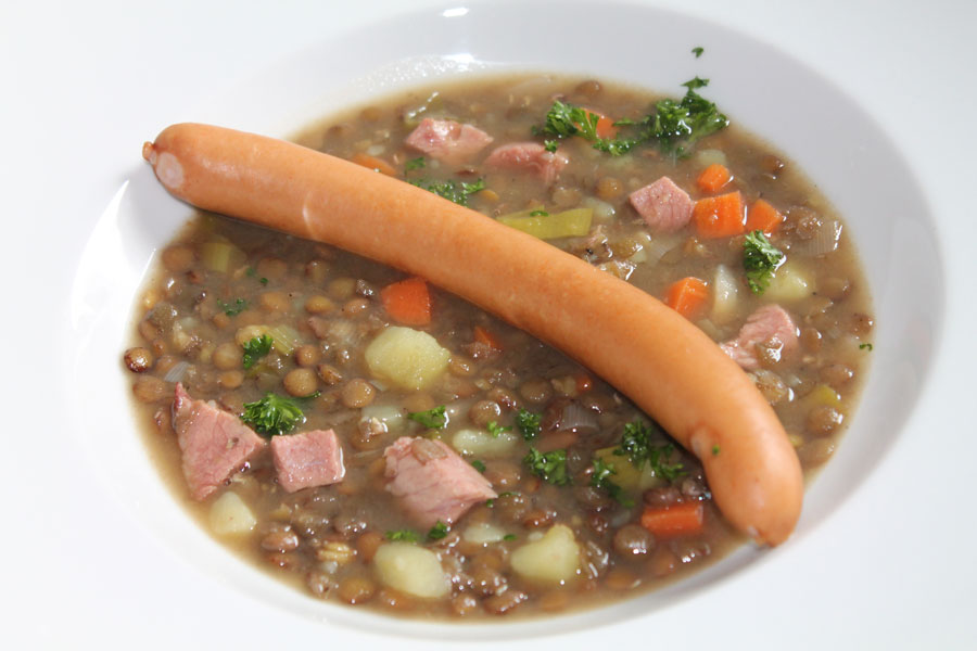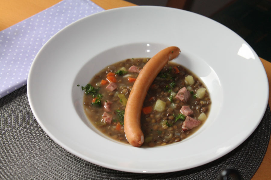 Diese kräftige deftige Linsensuppe ist ein deutscher Klassiker. Ich kenne diese Suppe aus meiner Kindheit und bereite sie immer noch so zu wie meine Mutti sie zubereitet hat, die einzige Abwandlung ist die Wahl einer anderen Essigsorte.