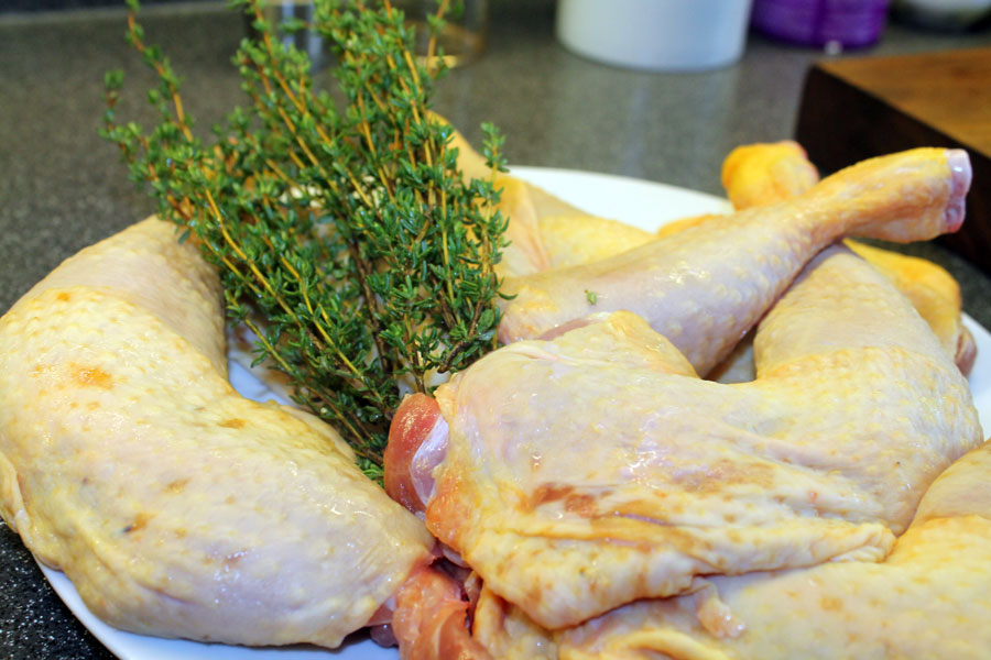 Die Keulen von beiden Seiten mit Salz würzen, dann von der Oberseite die Haut etwas lösen, unter der Haut das Fleisch mit Salz einreiben und die Thymianzweige unter die Haut stecken.