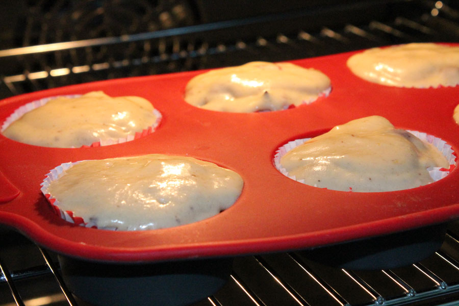 Die Muffins sind fertig gebacken, wenn man mit einem Holzstäbchen hineinsticht und kein Teig mehr hängen bleibt.