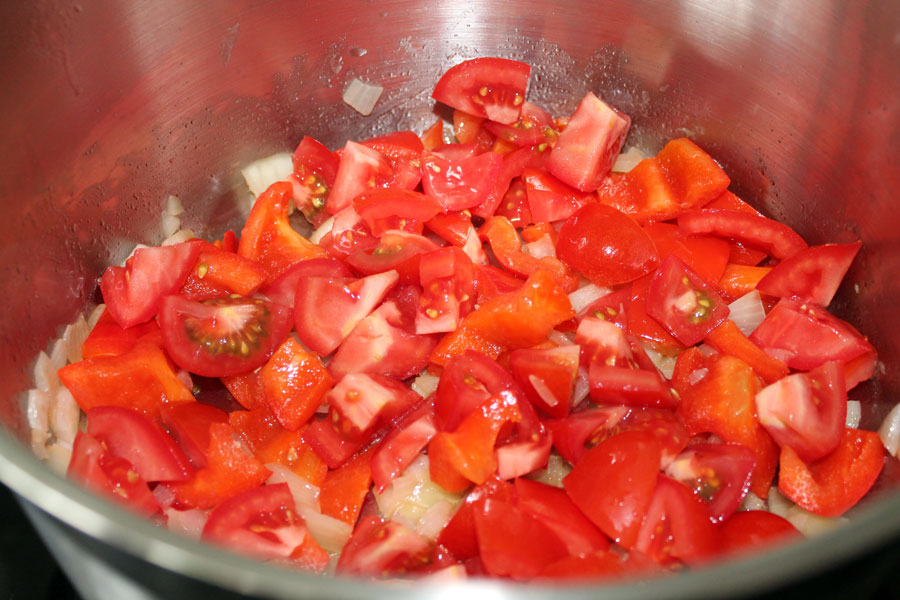 Die Paprikaschote und die Tomaten in den Topf geben, mit Salz würzen und weich garen.
