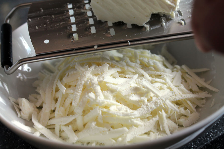 Den Schafskäse reiben und gleichmäßig auf den Nudeln verteilen.