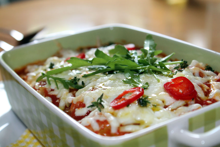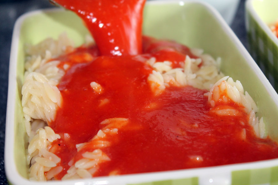 Die Pasta portionsweise in kleine Auflaufformen geben und mit der Tomatensauce leicht bedecken.