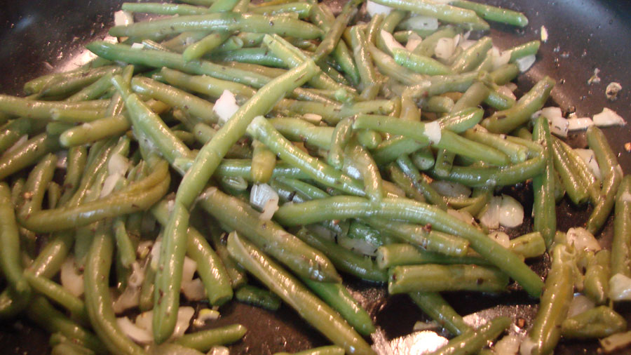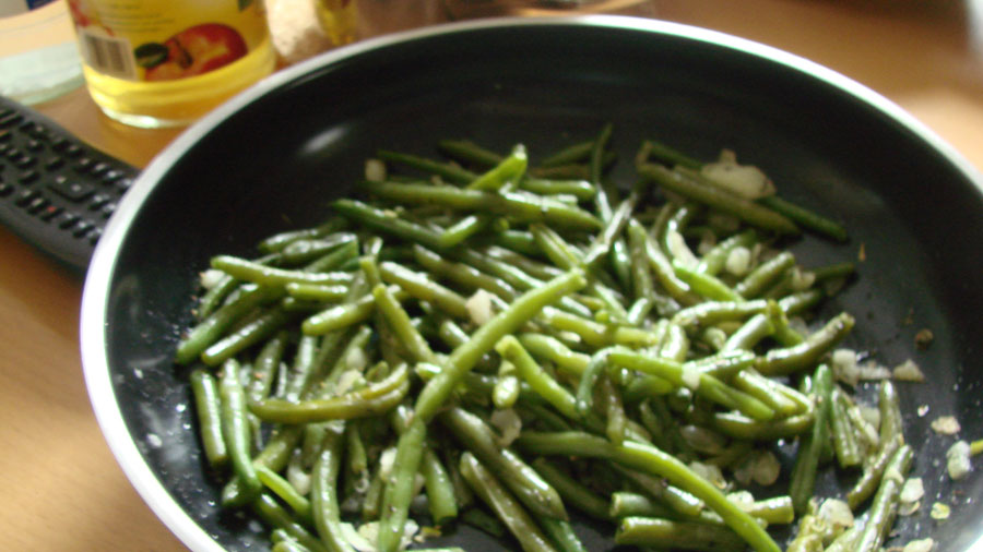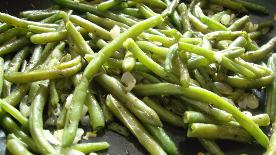 Das Bohnenkraut und die abgetropften grünen Bohnen dazugeben.
