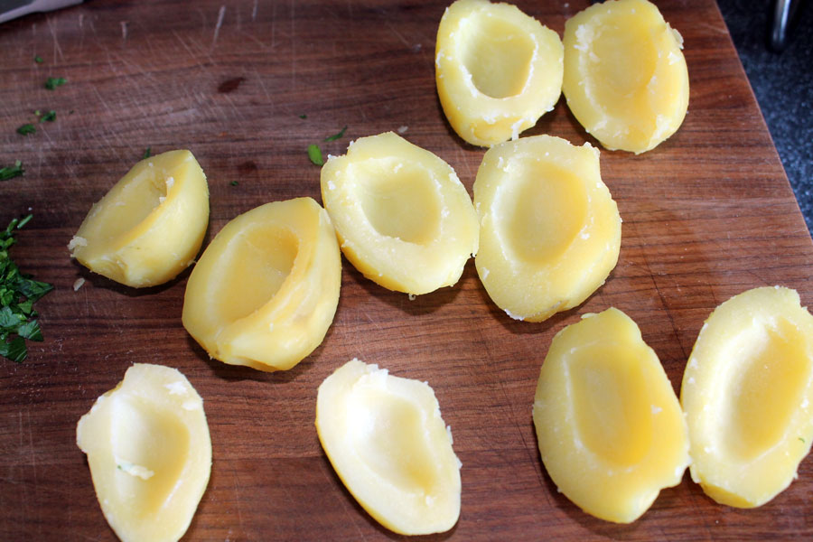 Beide Hälften am besten mit einem Kugelausstecher etwas aushöhlen und das herausgekratzte Kartoffelmus in eine Schüssel geben.