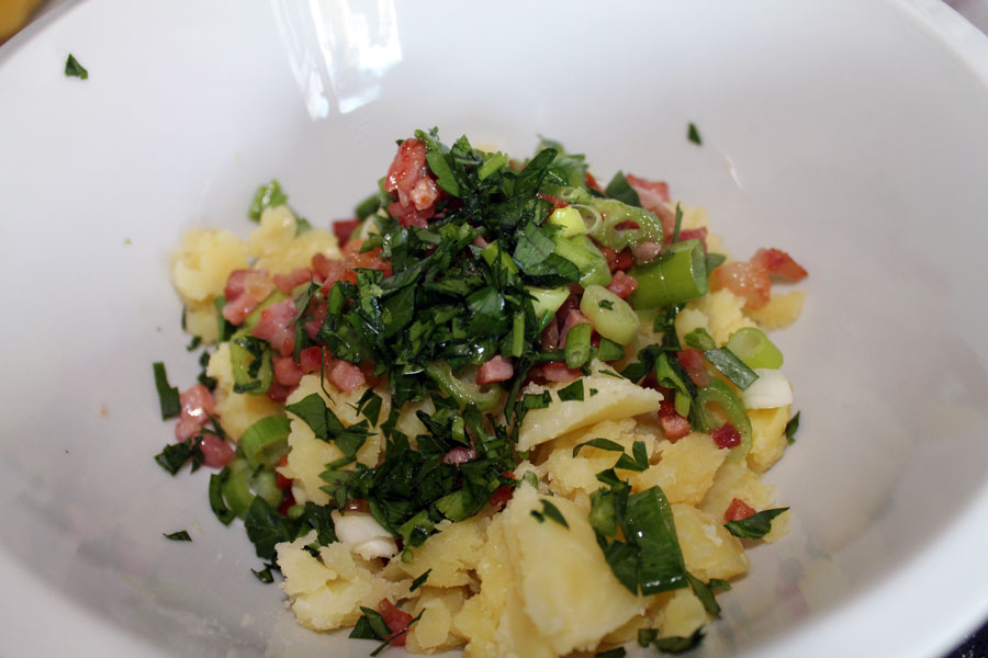 Alles zu dem Kartoffelmus geben und die Petersilie dazugeben.